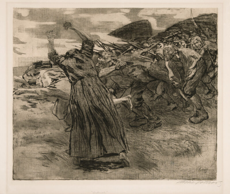 Losbruch (Blatt 5 aus dem Zyklus "Bauernkrieg"). Radierung auf chamoisfarbenem Kupferdruckkarton. 1902/03. 49 x 58 (55,4 x 68) cm.