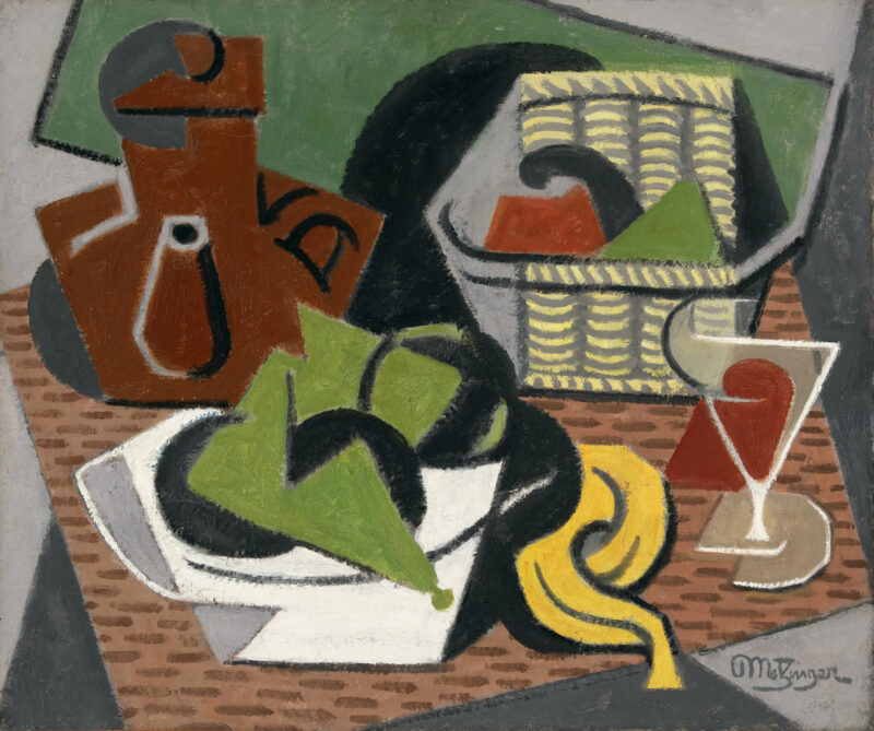 Mittelmann AM-46-003 - Mit einer Authentizitätsbestätigung von Alexander Mittelmann vom 17. Dezember 2020. - Provenienz: Galerie Rive Gauche, Paris; Niveau Gallery, New York; Sammlung Lee Ault, New York; Sammlung Theodore Schempp, New York; 1962 Privatsammlung; 1980 Sammlung John L. Strauss (durch Erbfolge); James Goodman Gallery, New York; Privatsammlung Kanada; Privatsammlung; seit 2010 Privatsammlung Baden-Württemberg. - Ausgestellt in: Jean Metzinger. Un Maître du Cubisme. Paris, Galerie Rive Gauche, 1951; University of Chicago, The David and Alfred Smart Gallery, 1980 (verso Ausstellungsetikett). - Jean Metzinger, Mitbegründer des Kubismus und Theoretiker der Bewegung, blieb zeitlebens dem analytischen Blick auf die Dinge verpflichtet. In unserem Stilleben wird die Welt nicht dargestellt, sondern neu gebaut - als geistige Konstruktion aus Farbe, Fläche und Form. Das Bild steht somit exemplarisch für den Weg, den Metzinger nach dem Ersten Weltkrieg einschlug: eine Rückbesinnung auf das Klassische, ohne die ihm innewohnende radikale Freiheit der Moderne preiszugeben. - Typisch für Metzinger ist der kontrollierte Umgang mit Farbe: Erdige Rot- und Brauntöne, kontrastiert durch scharf gesetztes Schwarz, werden ergänzt durch lebendiges Grün und leuchtendes Gelb. Auf den ersten Blick zeigt das Stilleben eine klassische Anordnung: Früchte, eine Karaffe, Gläser, ein Korb. Doch Metzinger zerlegt die Gegenstände in flächige, geometrisch gefasste Formen, die sich zu einer rhythmischen, beinahe musikalischen Komposition zusammenzufügen scheinen und so ihre stoffliche Schwere zugunsten einer fast tänzerischen Dynamik innerhalb des Bildraums verlieren. Dadurch erhebt Metzinger das Stilleben nicht nur zum Sinnbild einer formalen Neudefinition der Wirklichkeit, sondern auch zu einem stillen Triumph des Geistes über das bloß Sichtbare - durchdacht, harmonisch und zeitlos modern. - Die Leinwand doubliert. Craquelé.