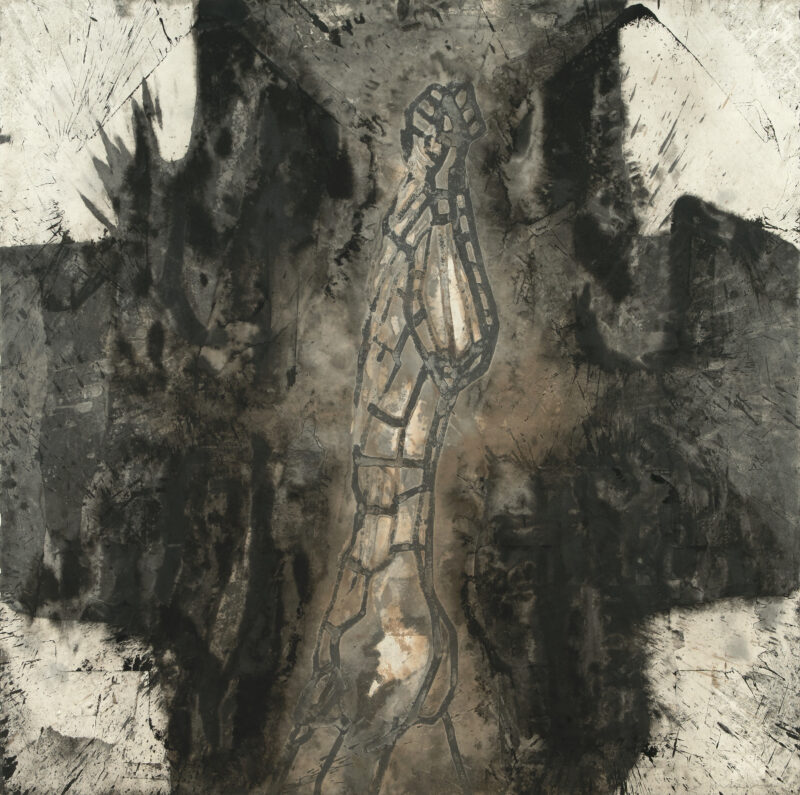Schreitender. Tuschlavage u. Asphaltlack mit Schablone u. Prägung auf Büttenkarton. 1994. 122,5 x 123 cm. Unter Glas gerahmt.