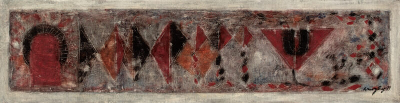 Provenienz: Galerie Falazik, Bochum; Sammlung Springhornhof, Neuenkirchen. - In diesem Werk verdichten sich Narayanans südindische Wurzeln mit den Impulsen der europäischen Avantgarde. Strenge geometrische Formen - Rhomben, Dreiecke, archaische Zeichen - fügen sich zu einer rhythmischen Bildordnung zusammen, durchzogen von erdigen Rot- und Schwarztönen. Die reliefartige Textur verstärkt die Spannung zwischen Strenge und Imagination, Ornament und Abstraktion. Narayanan, ausgebildet in Madras und an der École des Beaux-Arts in Paris, zählt zu den bedeutenden indischen Malern seiner Generation und wurde international vielfach ausgezeichnet.