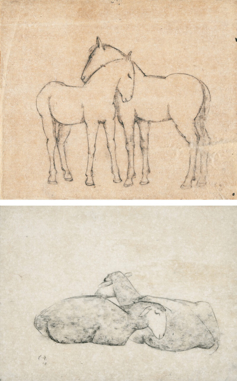 Zwei Pferde - Ruhende Schafe. Zwei Blatt. Schwarze Kreide auf Vliespapier. 1938. 20,3 x 24,2 bzw. 18 x 24,1 cm, jeweils unter Passepartout.