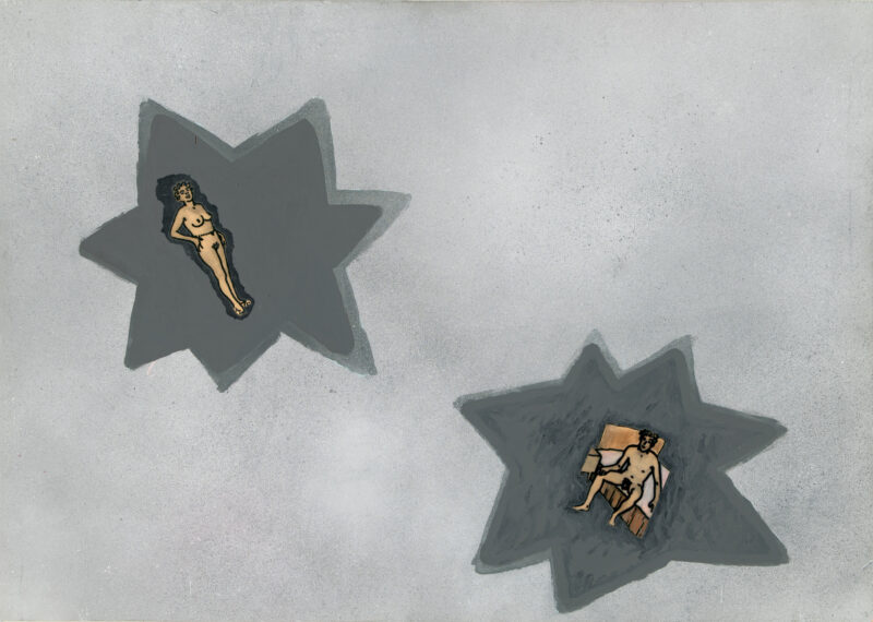 o.T. (Adam und Eva). Acryl, Lack u. collagierte Faserstiftzeichnungen auf Spanplatte. 1972. 60,5 x 85 cm.