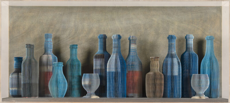 Pavlos eröffnete im Jahr 1960 sein erstes Atelier in der Rue Vaugirard in Paris, womit er sich in unmittelbarer Nachbarschaft von Jean Dubuffet befand, und wurde im darauffolgenden Jahrzehnt stark von den Nouveaux Réalistes um deren Gründer Pierre Restany beeinflusst, den er 1963 im Salon des Réalités Nouvelles kennengelernt hatte. Er wandte sich von der traditionellen Leinwandarbeit ab und begann mit seinen Experimenten aus zerschnittenen Posterstreifen. Aus diesen Nebenprodukten der Konsumgesellschaft entwickelte er seine ersten Arbeiten, allerlei Objekte des Alltags, die nur aus dünnen Papierstreifen in verschiedenen Farben bestanden. Das hier vorliegende frühe Flaschenstilleben - die ersten Formate dieser neuen Werkgruppe entstanden um 1973 - weisen Pavlos als souveränen Meister der Farbe aus. Die einzelnen Posterstreifen wurden von ihm sorgfältig ausgewählt und geprüft, sodass aus industriell produzierten Farbstrukturen poetische Landschaften oder Stilleben entstanden. Indem Pavlos den inhärenten Mustern neues Bedeutungspotenzial verlieh und sie zu alltäglichen Objekten unserer Umwelt formte, transformierte er das Vorgefundene in etwas Eigenständiges. Die weichen, pastellfarbenen Nuancierungen der Bar 2 belegen eindrucksvoll Pavlos' Fähigkeit, fein abgestufte Farbskalen subtil zu kombinieren. Die Schönheit, die hier aus dem vermeintlichen "Abfall" der Gesellschaft hervorgeht, verleiht seinem Werk eine zusätzliche Dimension und begründet seine herausragende Stellung innerhalb der europäischen Neuen Realisten und der Pop Art. - Der Plexiglaskasten mit vereinzelten winzigen Kratzspuren sowie mit zwei Läsuren in der linken Seitenkante.
