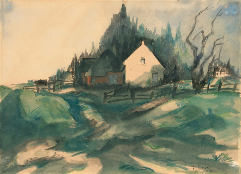 Bauernhof bei Dangast. Aquarell u. Feder in Tusche auf bräunlichem Karton. 1924. 36 x 49 cm, unter Passepartout. Unter Glas gerahmt.