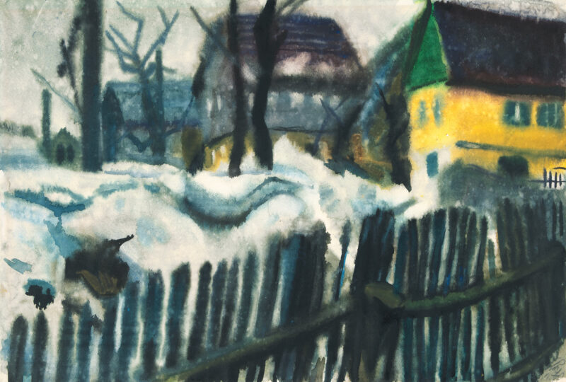 Die Gasse im Winter (Frankes Haus). Aquarell auf Büttenkarton. 1970. 37,8 x 56 cm, unter Passepartout. Unter Glas gerahmt.